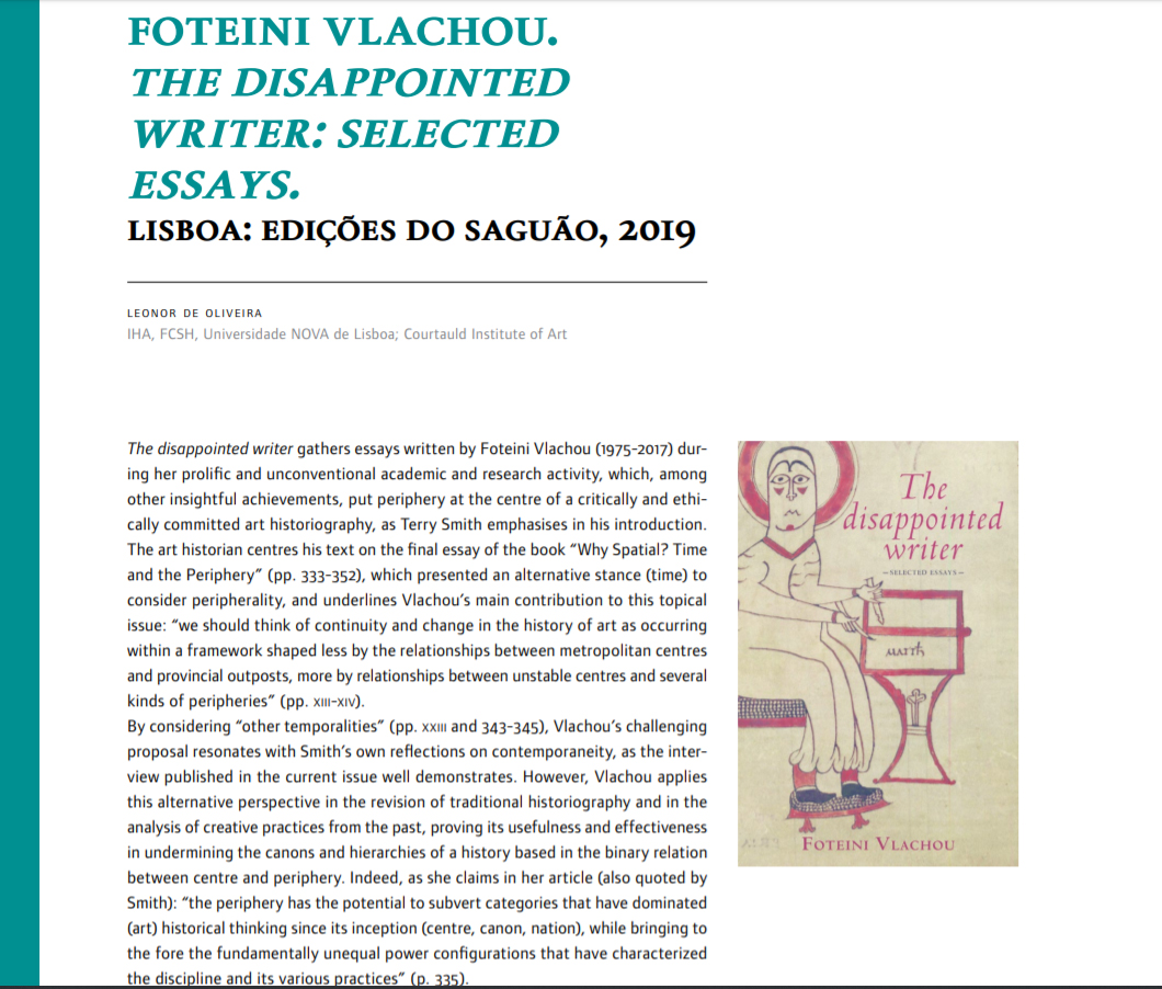 "The disappointed writer gathers essays written by Foteini Vlachou (1975-2017) during her prolific and unconventional academic and research activity, which, among other insightful achievements, put periphery at the centre of a critically and ethically committed art historiography, as Terry Smith emphasises in his introduction.