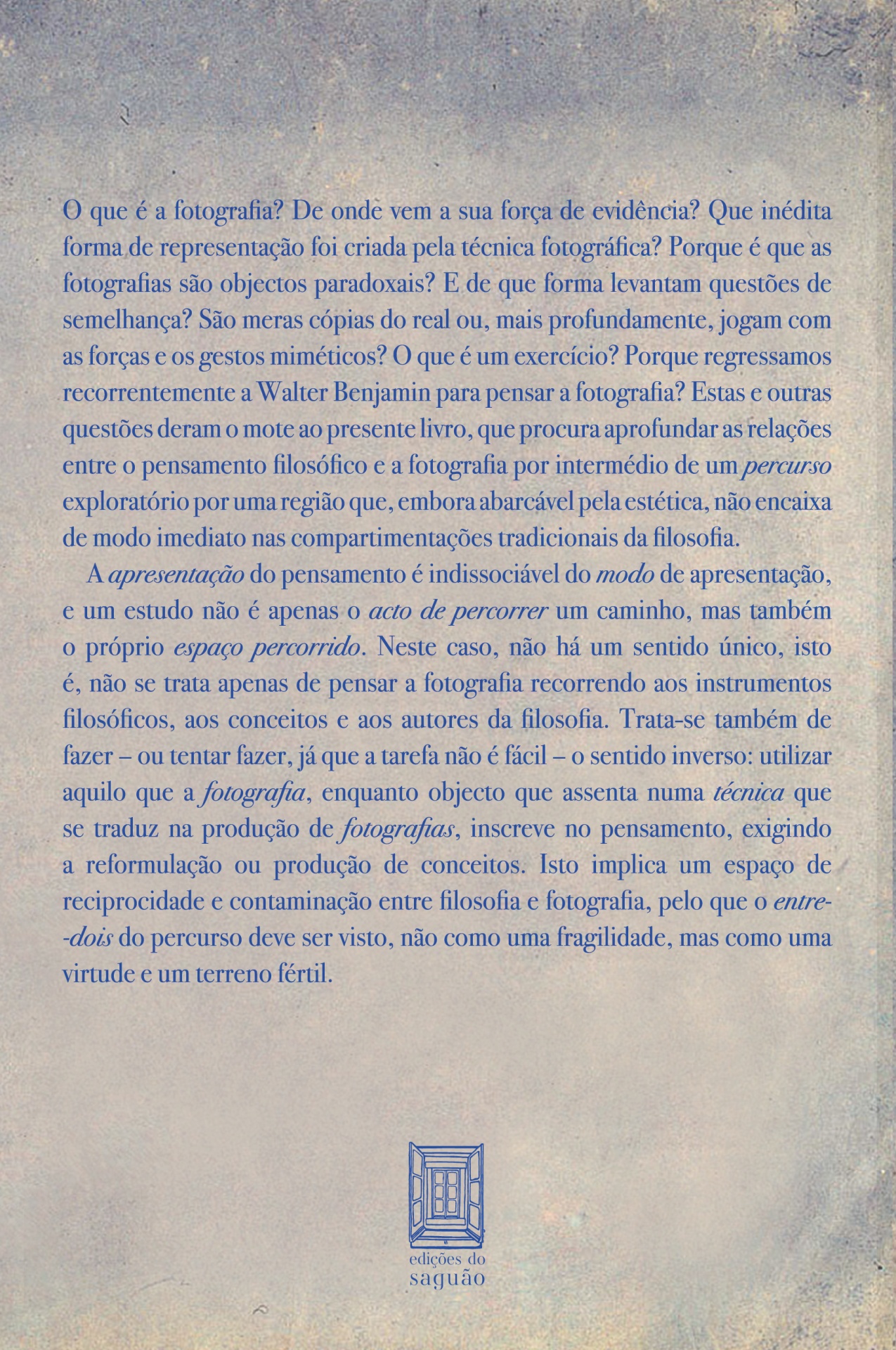 O que é a fotografia? De onde vem a sua força de evidência? Que inédita forma de representação foi criada pela técnica fotográfica? Porque é que as fotografias são objectos paradoxais? E de que forma levantam questões de semelhança? São meras cópias do real ou, mais profundamente, jogam com as forças e os gestos miméticos? O que é um exercício? Porque regressamos recorrentemente a Walter Benjamin para pensar a fotografia? Estas e outras questões deram o mote ao presente livro, que procura aprofundar as relações entre o pensamento filosófico e a fotografia por intermédio de um percurso exploratório por uma região que, embora abarcável pela estética, não encaixa de modo imediato nas compartimentações tradicionais da filosofia.