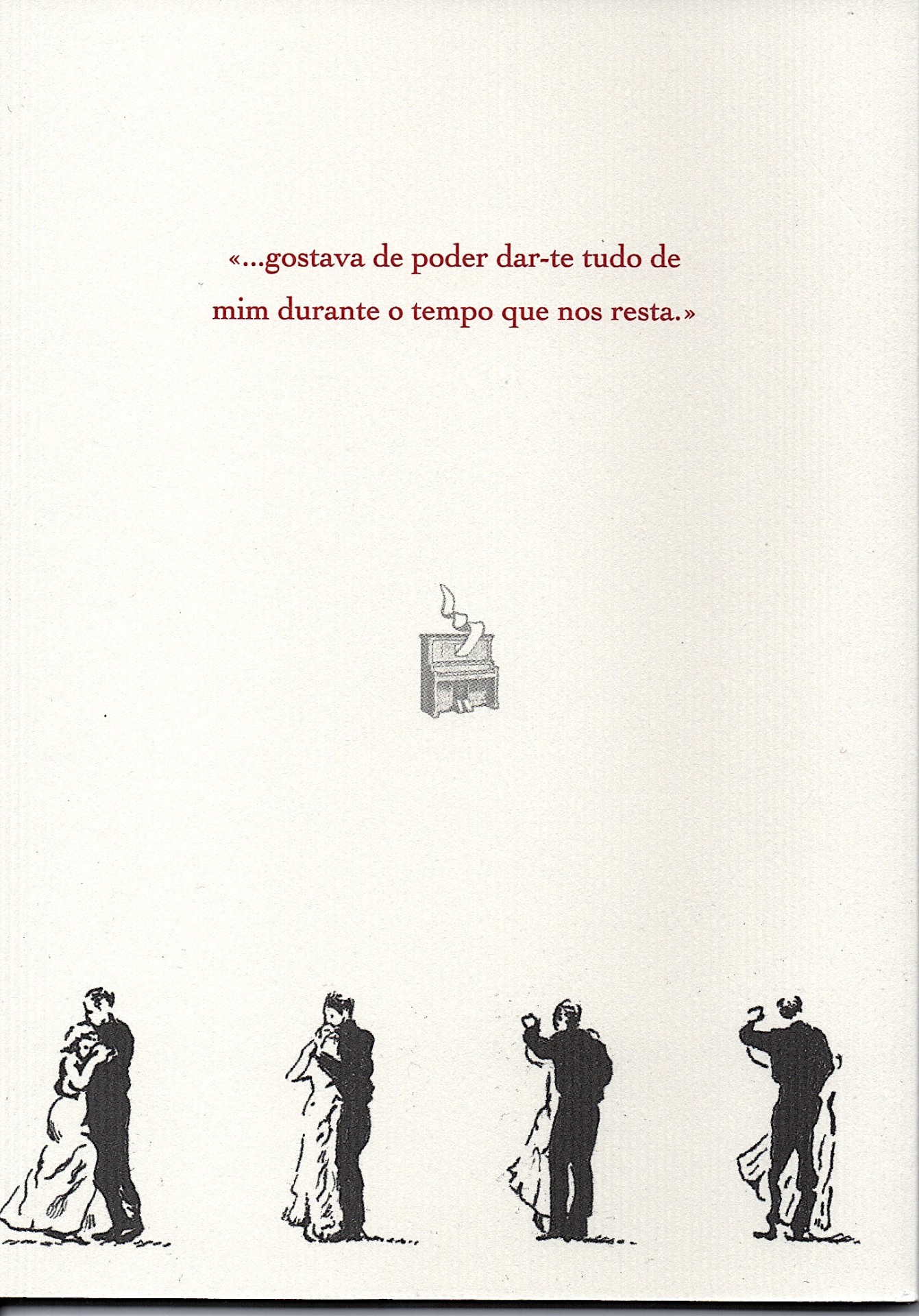 «Vais fazer oitenta e dois anos. Perdeste seis centímetros de altura, só pesas quarenta e cinco quilos e continuas bela, graciosa e apetecível. Vivemos juntos há cinquenta e oito anos e amo-te mais do que nunca. Sinto outra vez no fundo do meu peito um vazio devorador que só o calor do teu corpo contra o meu pode encher.»