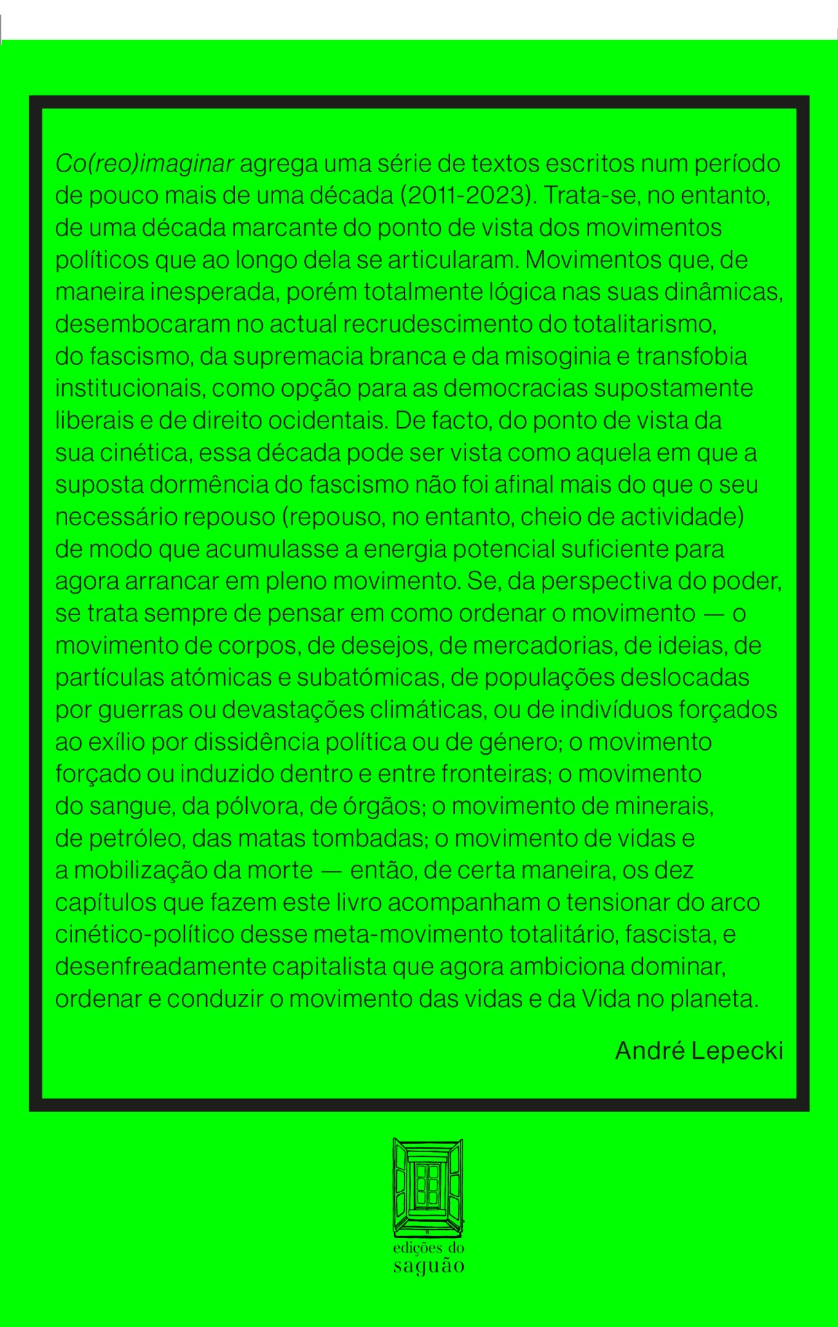Co(reo)imaginar agrega uma série de textos escritos num período de pouco mais de uma década (2011-2023). Trata-se, no entanto, de uma década marcante do ponto de vista dos movimentos políticos que ao longo dela se articularam. Movimentos que, de maneira inesperada, porém totalmente lógica nas suas dinâmicas, desembocaram no actual recrudescimento do totalitarismo, do fascismo, da supremacia branca e da misoginia e transfobia institucionais, como opção para as democracias supostamente liberais e de direito ocidentais. De facto, do ponto de vista da sua cinética, essa década pode ser vista como aquela em que a suposta dormência do fascismo não foi afinal mais do que o seu necessário repouso (repouso, no entanto, cheio de actividade) de modo que acumulasse a energia potencial suficiente para agora arrancar em pleno movimento. Se, da perspectiva do poder, se trata sempre de pensar em como ordenar o movimento — o movimento de corpos, de desejos, de mercadorias, de ideias, de partículas atómicas e subatómicas, de populações deslocadas por guerras ou devastações climáticas, ou de indivíduos forçados ao exílio por dissidência política ou de género; o movimento forçado ou induzido dentro e entre fronteiras; o movimento do sangue, da pólvora, de órgãos; o movimento de minerais, de petróleo, das matas tombadas; o movimento de vidas e a mobilização da morte — então, de certa maneira, os dez capítulos que fazem este livro acompanham o tensionar do arco cinético-político desse meta-movimento totalitário, fascista, e desenfreadamente capitalista que agora ambiciona dominar, ordenar e conduzir o movimento das vidas e da Vida no planeta.