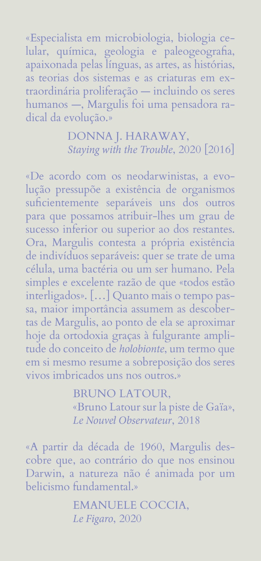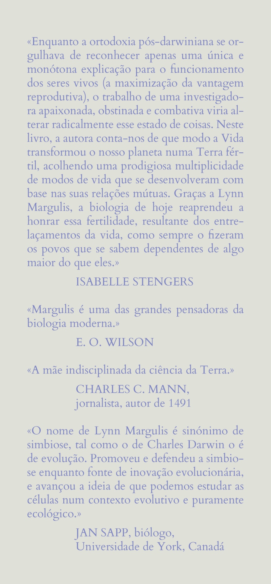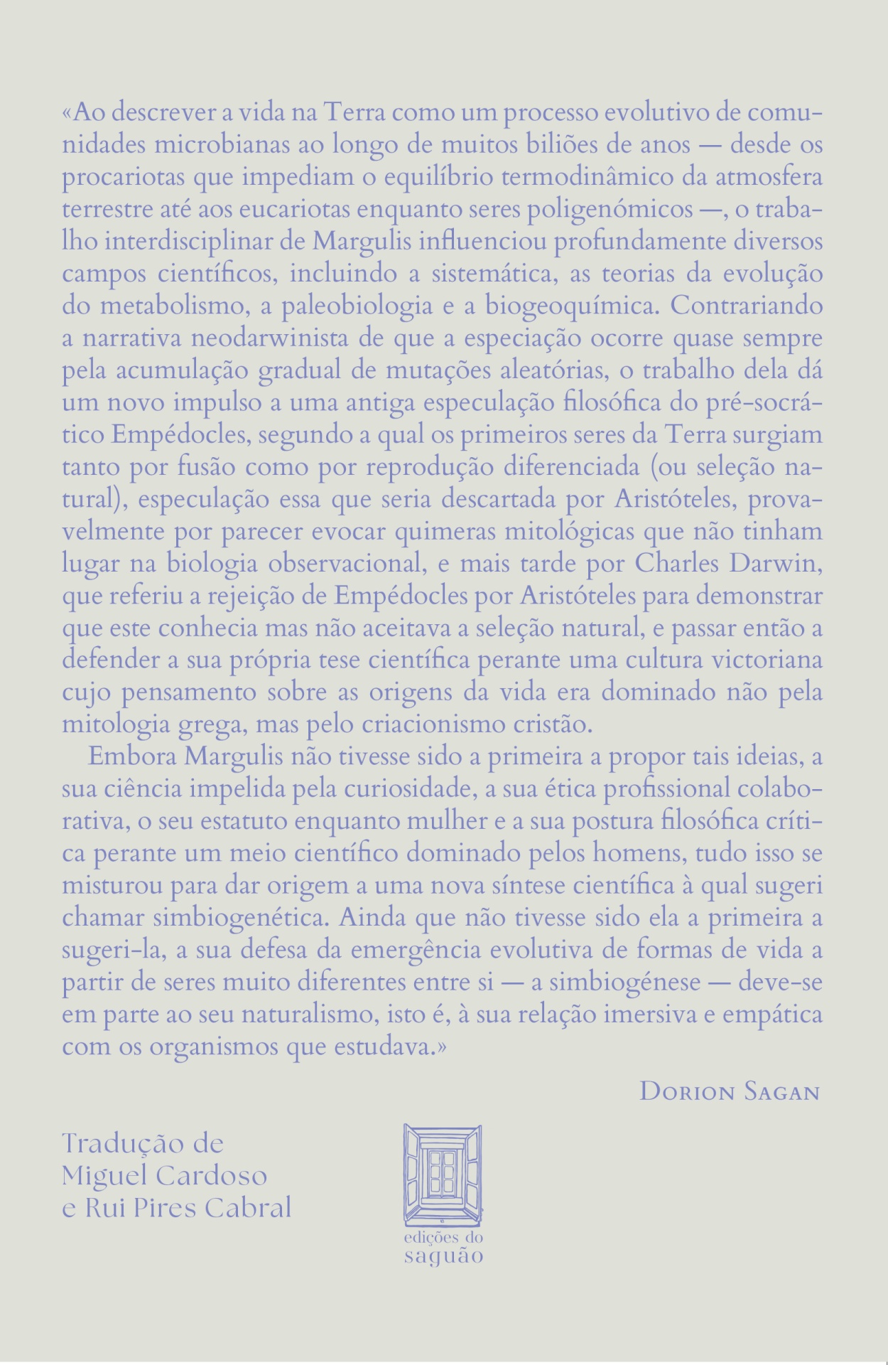 Embora Margulis não tivesse sido a primeira a propor tais ideias, a sua ciência impelida pela curiosidade, a sua ética profissional colaborativa, o seu estatuto enquanto mulher e a sua postura filosófica crítica perante um meio científico dominado pelos homens, tudo isso se misturou para dar origem a uma nova síntese científica à qual sugeri chamar simbiogenética. Ainda que não tivesse sido ela a primeira a sugeri-la, a sua defesa da emergência evolutiva de formas de vida a partir de seres muito diferentes entre si — a simbiogénese — deve-se em parte ao seu naturalismo, isto é, à sua relação imersiva e empática com os organismos que estudava.»