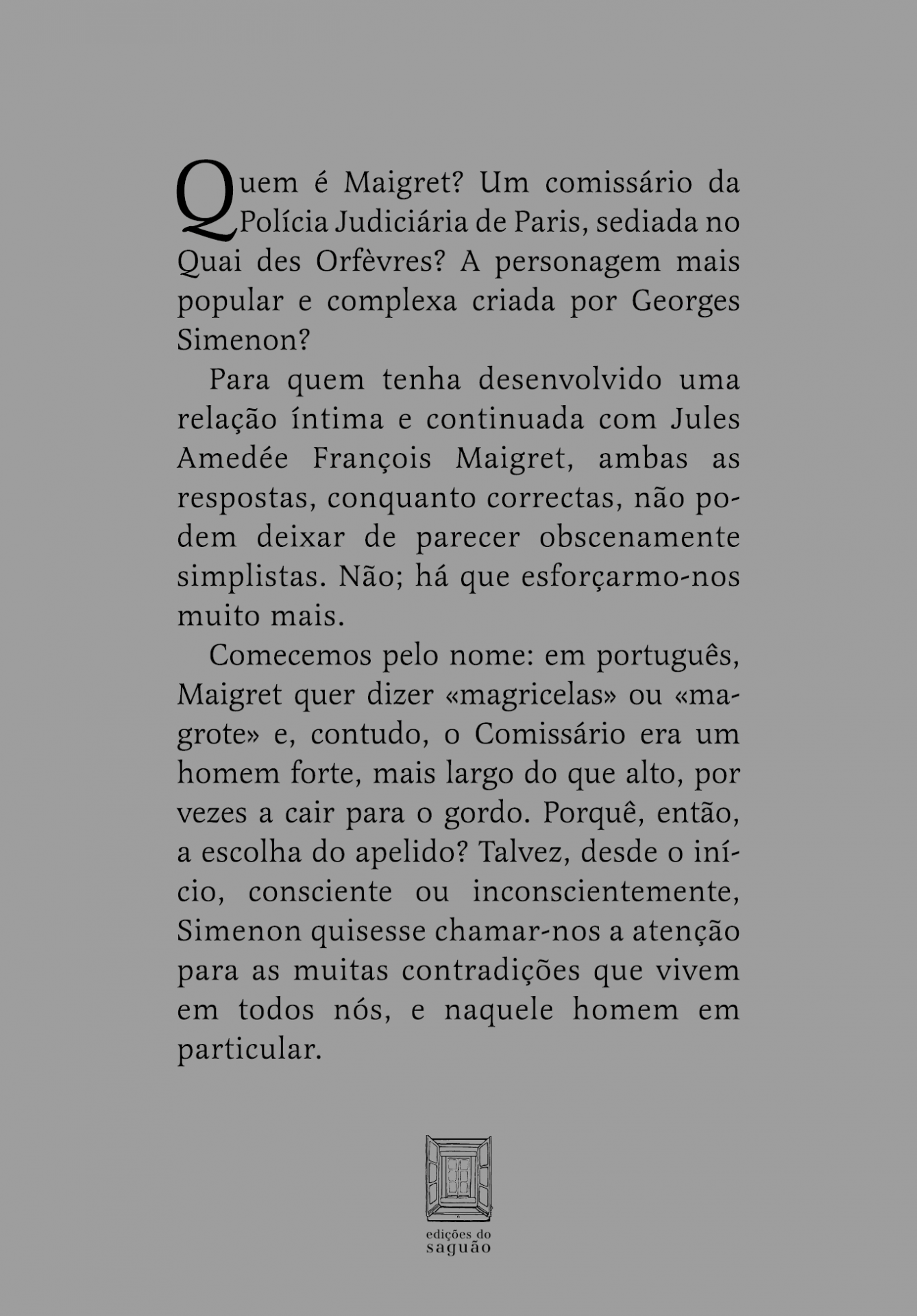 «Quem é Maigret? Um comissário da Polícia Judiciária de Paris, sediada no Quai des Orfèvres? A personagem mais popular e complexa criada por Georges Simenon?